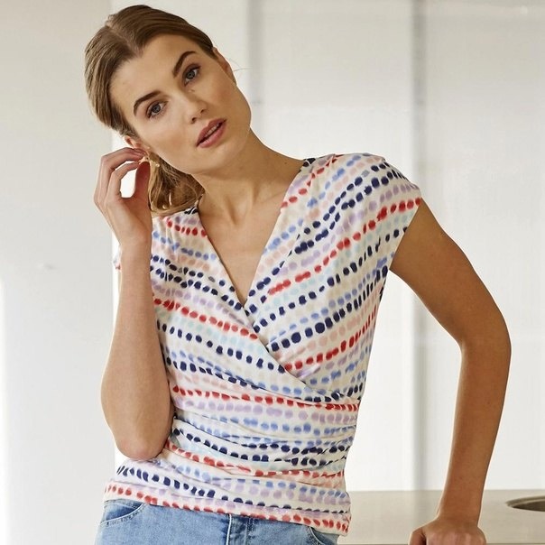 Блузка женская, имеющая застежку на запах, образующую V-образный вырез на блузке. Доступны размеры выкройки от 34 до 56 по европейской системе.